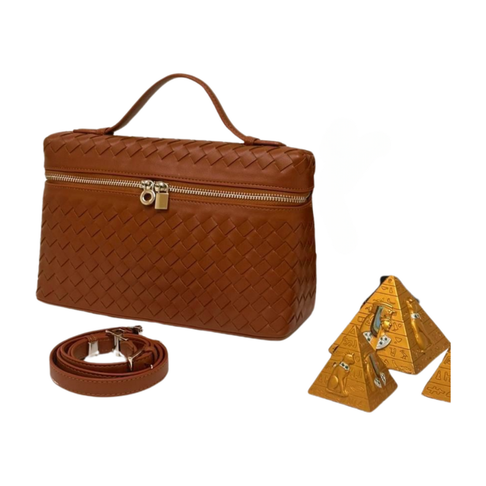 - تضفي الحلي النحاسية لمسة جمالية راقية ومظهرًا فاخرًا للحقيبة.